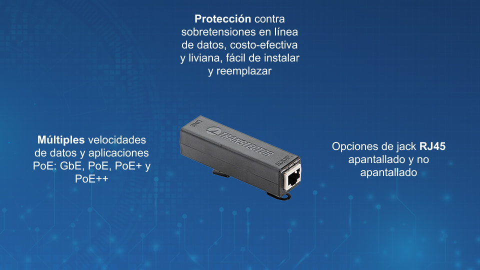La oferta de protección contra alta tensión de la línea de datos transtector incluye unidades optimizadas para PoE, PoE +, PoE ++, Gigabit Ethernet, Gigabit PoE, Ethernet, RS-232 | RS-422 | RS-485, CCTV, DeviceNet y otras señales de baja tensión.